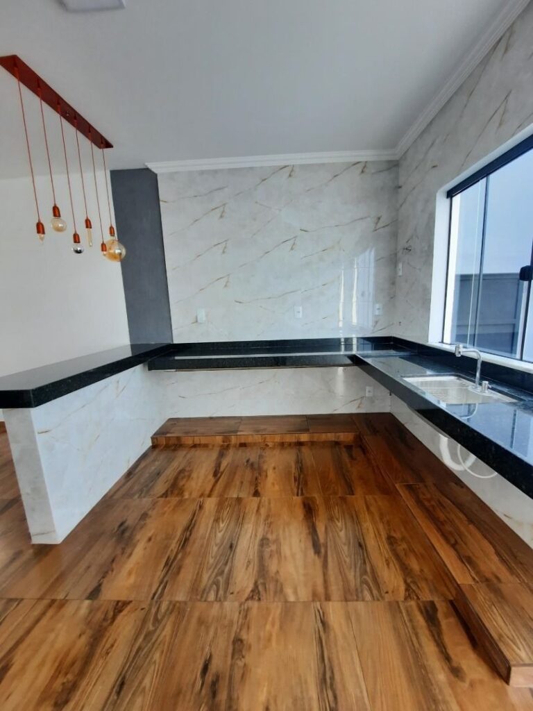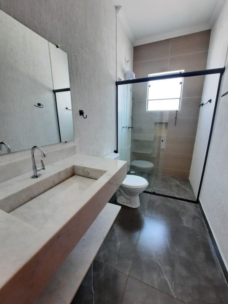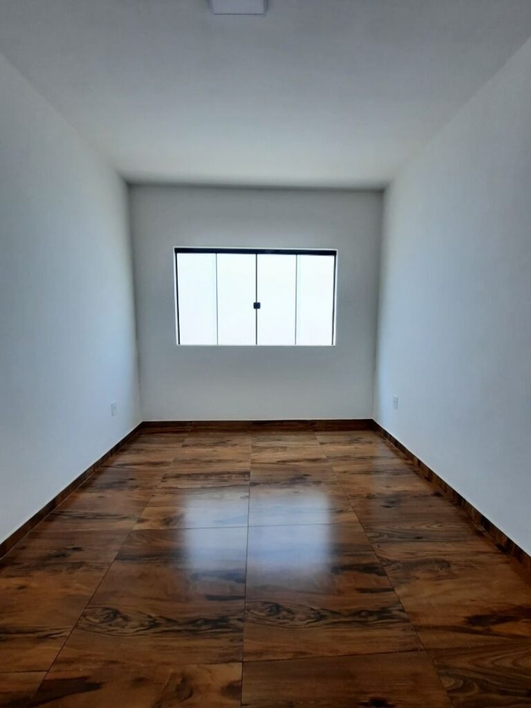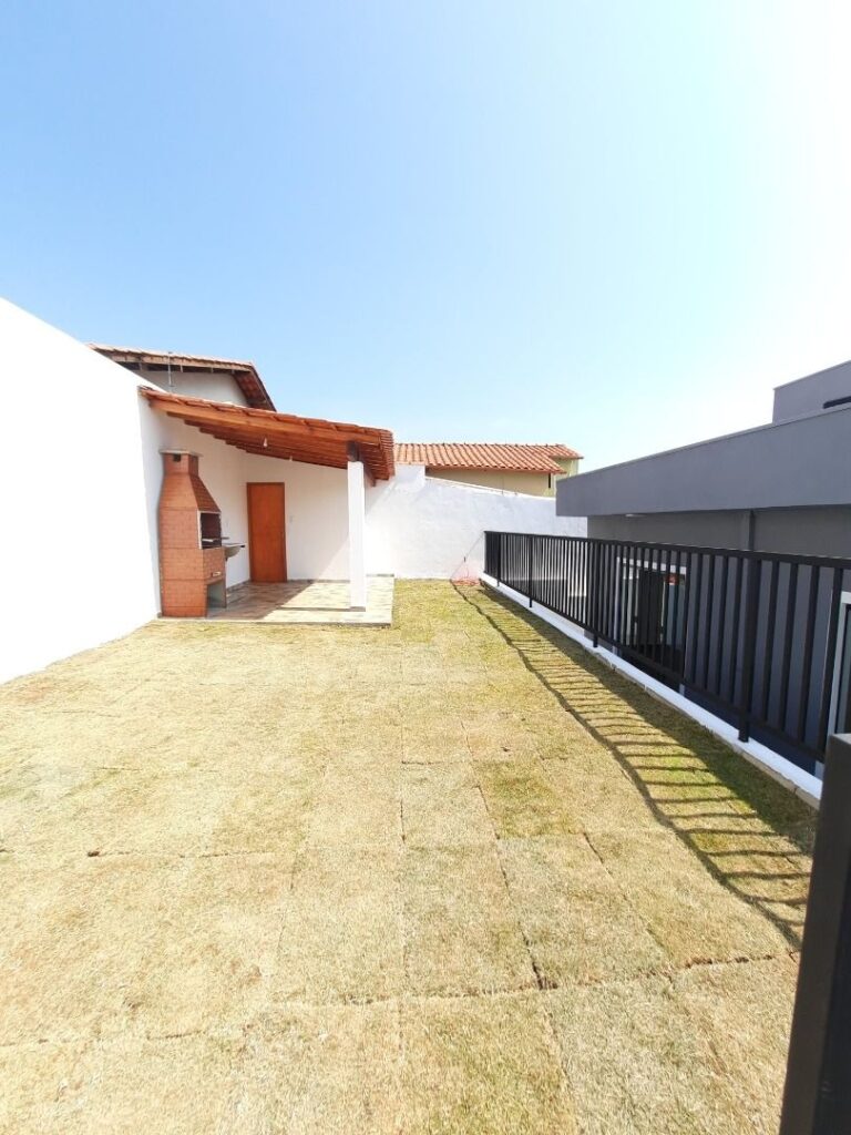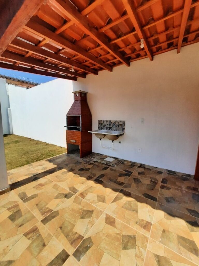 Composta por 3 quartos (sendo 1 suíte), sala, copa, cozinha funcional, banheiro social, além de área gourmet com churrasqueira e banheiro externo. Possui área verde, garagem para 2 carros, portão eletrônico, aquecedor solar, duchas e lâmpadas instaladas e cerca protetora no muro.